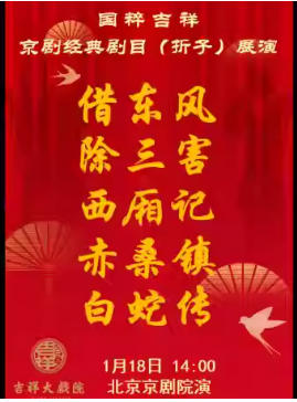吉祥大戏院1月18日(午场)京剧《借东风》《除三害》《西厢记》《赤桑镇》《白蛇传》国粹吉祥系列 时间:2026.01.18 周日 14:00 场馆:北京市 | 吉祥大戏院 票价:100/200/280/300/380 微信订票:18515362586 电话订票:010-66552100,010-66552258